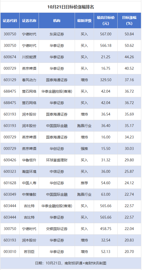 南财投研通数据显示,10月21日,券商给予上市公司目标价共32次,按最新收盘价计算,目标价涨幅排名居前的公司有宁德时代、川投能源、燕京啤酒,目标价涨幅分别为51%、44.26%、40.52%,分别属于电池、电力、食品饮料行业。